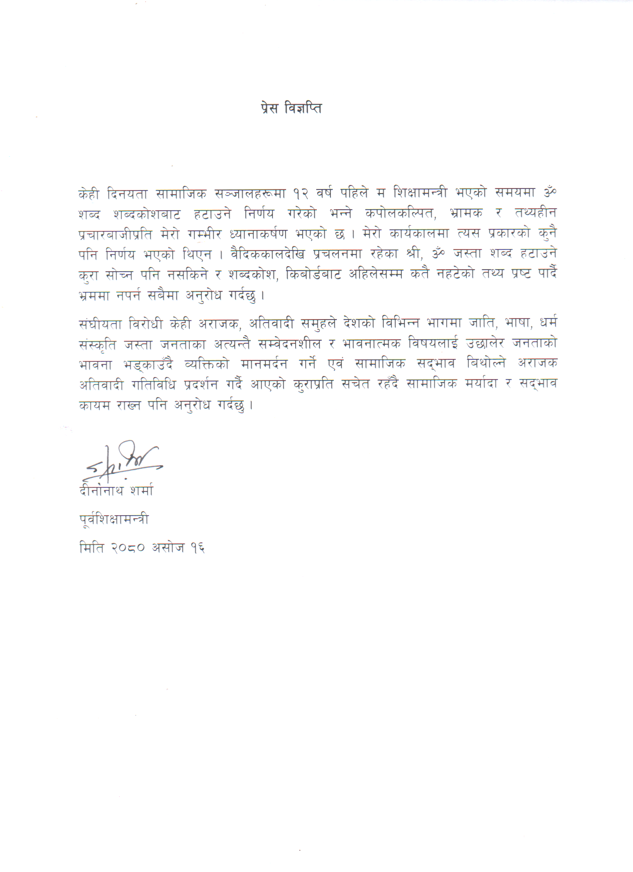 वैदिककालदेखि प्रचलनमा रहेका श्री, ॐ जस्ता शब्द हटाउने कुरा सोच्न पनि नसकिने र शब्दकोश, किबोर्डबाट अहिलेसम्म कतै नहटेको तथ्य प्रष्ट पार्दै भ्रममा नपर्न सबैमा अनुरोध गर्दछु । शर्माले संघीयता विरोधी अराजक, अतिवादी समुहले देशको विभिन्न भागमा जाति, भाषा, धर्म संस्कृति जस्ता जनताका अत्यन्तै सम्वेदनशील र भावनात्मक विषयलाई उछालेर जनताको भावना भड्काइरहेको भन्दै सचेत हुन आग्रह समेत गरेका छन् ।