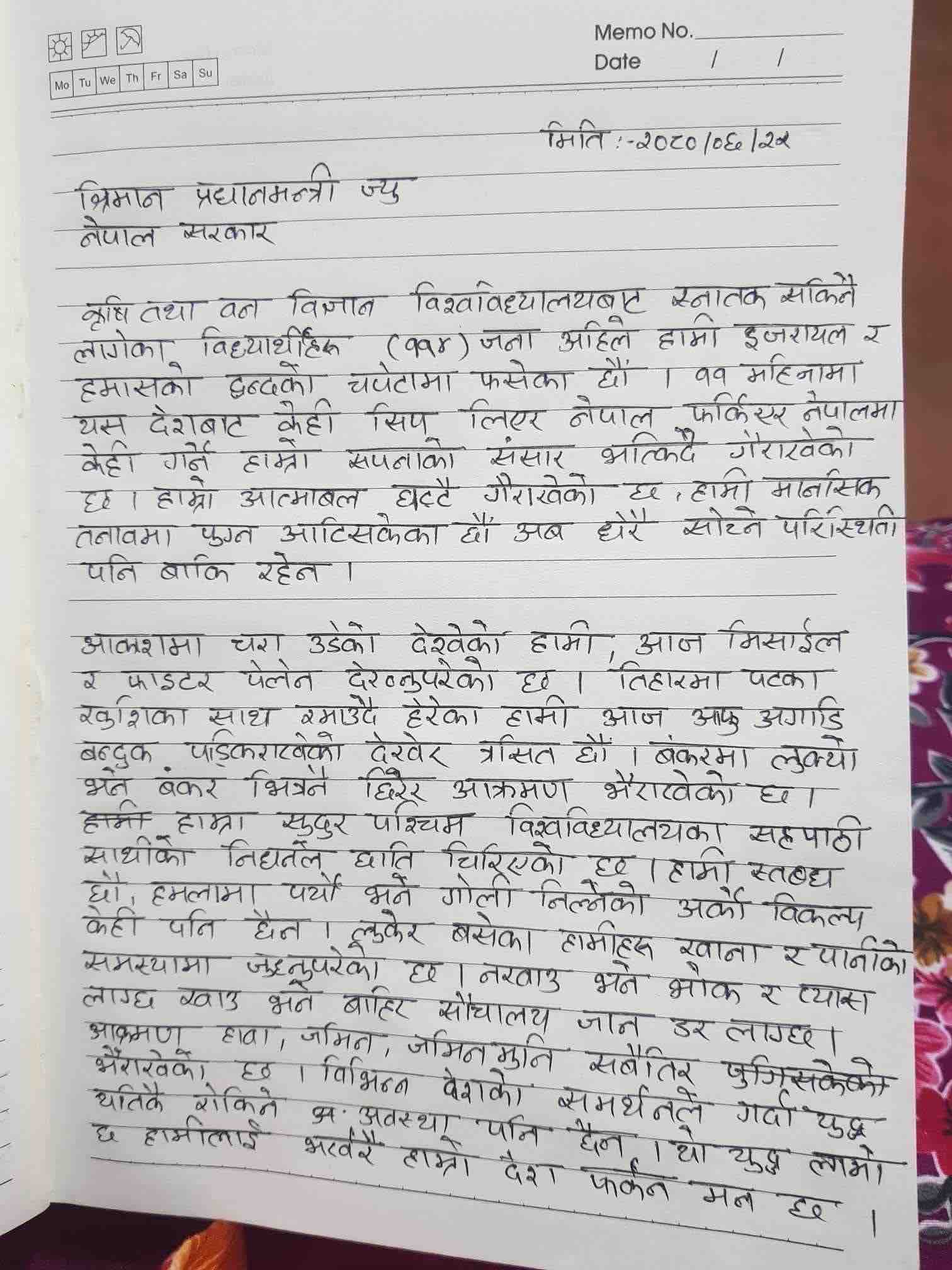 ‘आदरणीय प्रधानमन्त्री ज्यू, अबको हाम्रो आशा पनि तपाईं नै हो, भरोसा पनि तपाईं नै हो,’ उनले पत्रमा लेखेका छन्, ‘यो दुई देश बीचको युद्धको चपेटामा परेर ज्यान गुमाउन मन छैन, हामीलाई हाम्रो देश आउने वातावरण मिलाइदिनुहोस्। हामी देशमा नै रमाउने छौँ।’