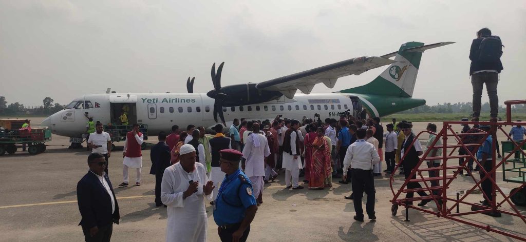 ओली एती एयरलाइन्सको जहाज चढेर काठमाडौंबाट जनकपुर पुगेका थिए । एमाले नेता–कार्यकर्ताहरुको भीड हवाई जहाजको ढोकैमा पुग्यो ।
