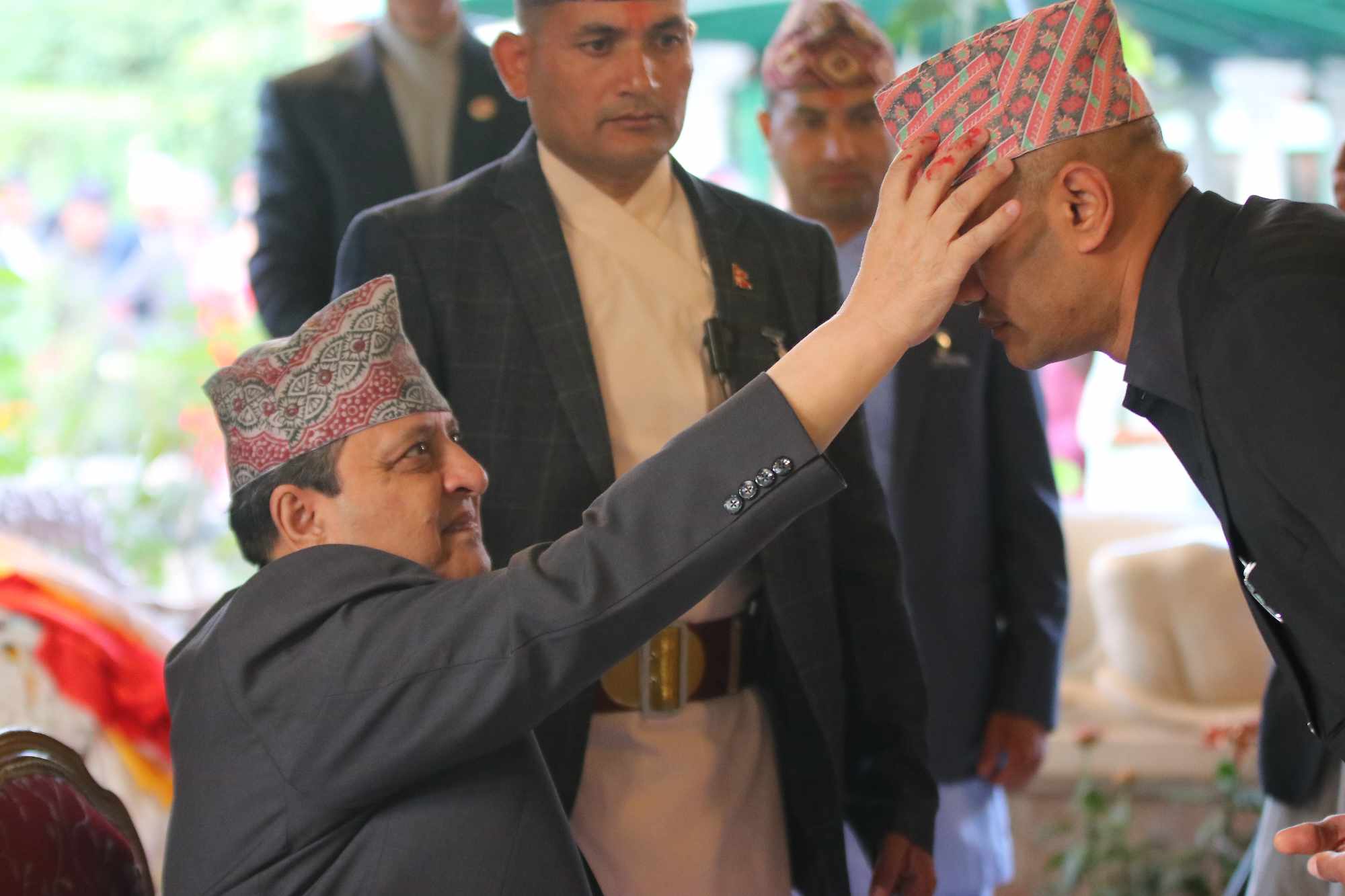 काठमाडौं, ७ कात्तिक ।  पूर्वराजा ज्ञानेन्द्र शाहले नेपालीहरुको महान चाड विजया दशमीको अवसरमा सर्वसाधारणलाई टीका लगाइदिएका छन् ।
