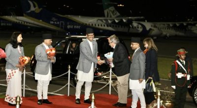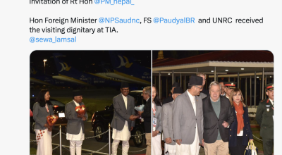 परराष्ट्रमन्त्री नारायणप्रकाश साउदले महासचिव गुटेरेसलाई त्रिभुवन अन्तर्राष्ट्रिय विमानस्थलमा स्वागत गरे ।