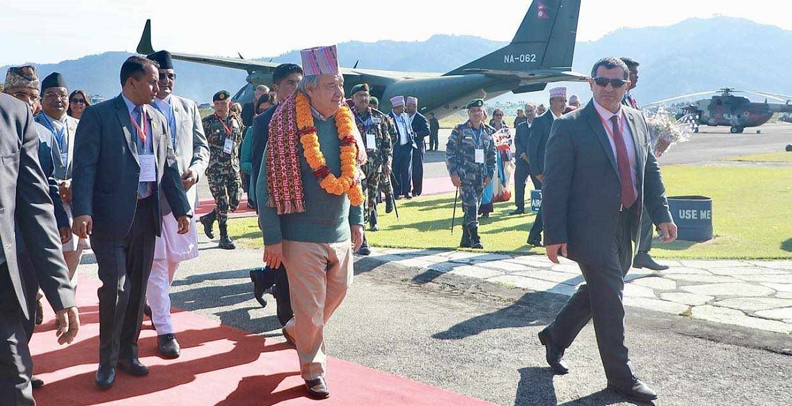काठमाडौं, १३ कात्तिक । संयुक्त राष्ट्रसंघका महासचिव एन्टोनियो गुटेरेस पोखरा आइपुगेका छन्। नेपाली सेनाको विशेष हेलिकोप्टरमार्फत् उनी पोखरा आइपुगेका हुन्।