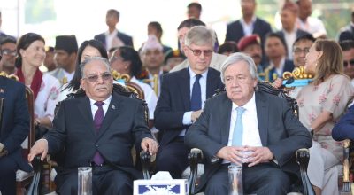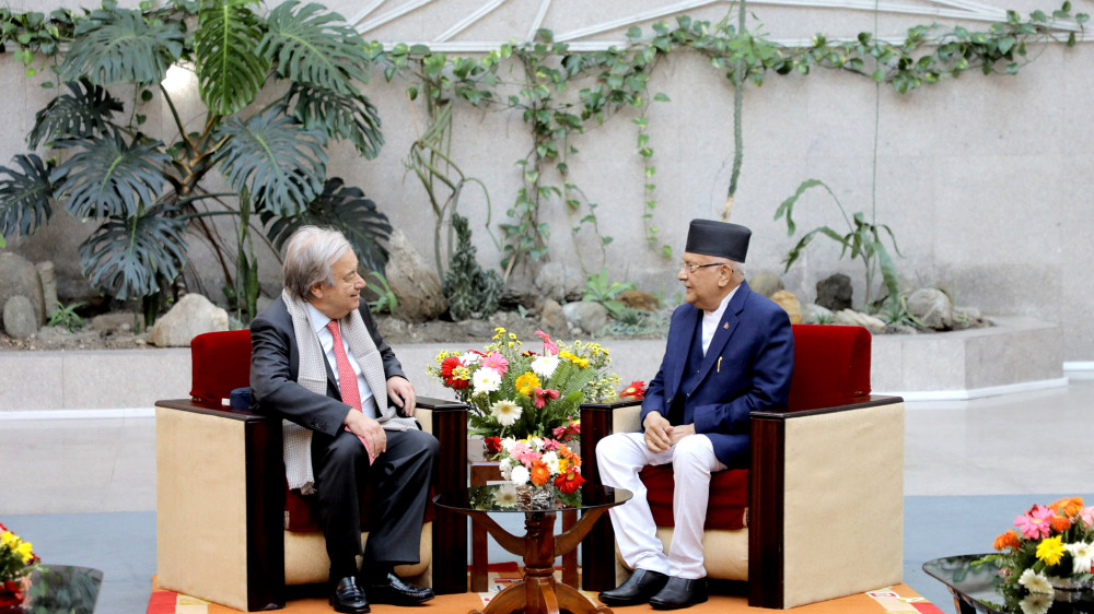काठमाडौं, १४ कातिक । नेपालको औपचारिक चारदिने भ्रमणमा आइतबार बिहान काठमाडौँ नेपाल उत्रिएकै दिन संयुक्त राष्ट्रसंघ (यूएन) का महासचिव एन्टोनियो गुटेरेसले नेपालको शान्ति प्रक्रिया टुंगो लगाउन दलहरूसँग उच्चस्तरीय भेटवार्ता गरे। महासचिव गुटेरेसले सोही दिन प्रधानमन्त्री पुष्पकमल दाहाल प्रचण्डसँग उच्चस्तरीय भेटवार्ता गरेपछि दलहरूलाई शान्ति प्रक्रिया र संक्रमणकालीन न्याय टुंगो लगाउन आवश्यक परे राष्ट्रसंघ सहयोग गर्न तत्पर रहेको बताए।