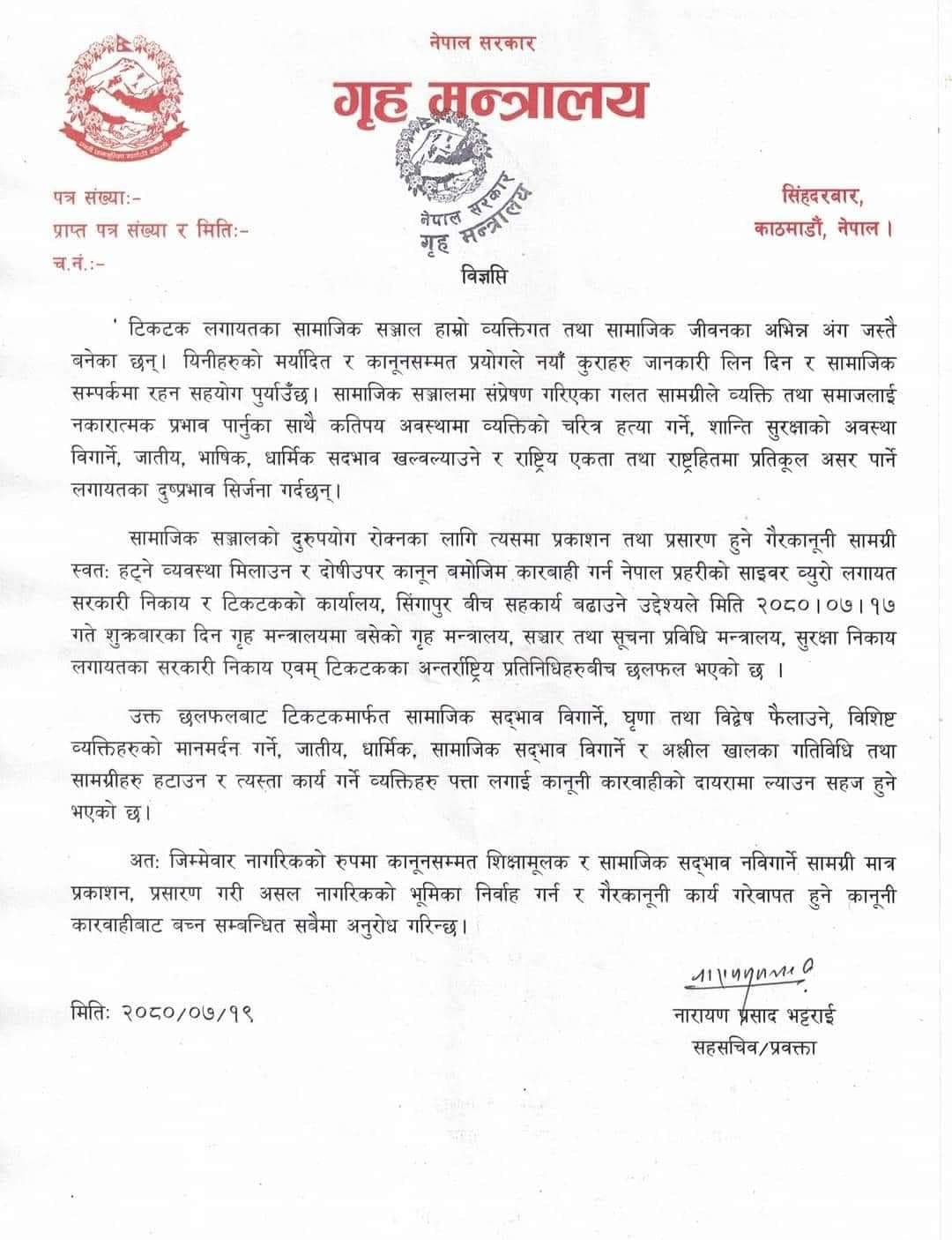सामाजिक सञ्जालको दुरुपयोग रोक्नका लागि त्यसमा प्रकाशन तथा प्रसारण हुने गैरकानूनी सामग्री स्वतस् हट्ने व्यवस्था मिलाउन र दोषीउपर कानून बमोजिम कारबाही गर्न नेपाल प्रहरीको साइबर ब्यूरो लगायत सरकारी निकाय र टिकटकको कार्यालय, सिंगापुरबीच सहकार्य बढाउने उद्देश्यले छलफल भएको गृह मन्त्रालयका सहसचिव एवं प्रवक्ता नारायणप्रसाद भट्टराईले बताएका छन्।