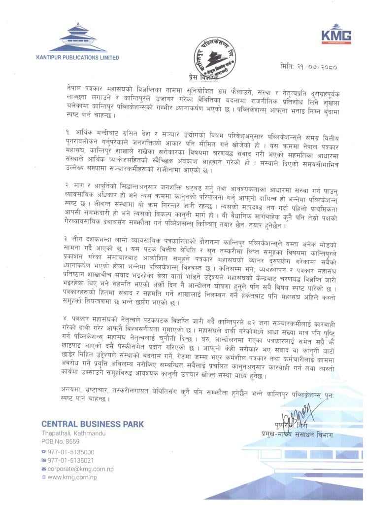 गैरव्यावसायिक दबाबसँग सम्झौता नगर्ने कान्तिपुरको प्रष्टोक्ति , काममा अवरोध गर्नेविरुद्ध कानूनी कारबाहीमा जाने
