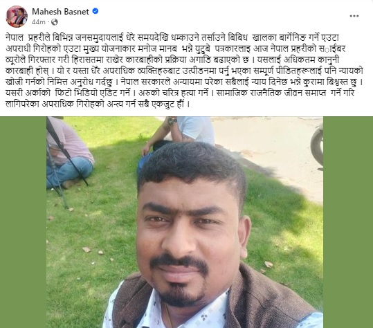 काठमाडौं, २३ कातिक । नेकपा एमालेका युवा नेता महेश बस्नेतले प्रहरीको साइबर ब्युरोले पक्राउ गरेका युट्युवर मनोज मानव आपराधिक गिरोहका मुख्य योजनाकार भएको बताएका छन् ।