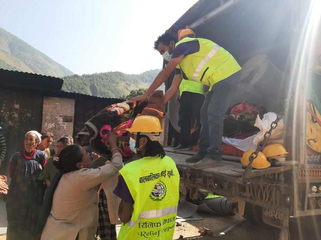 जिल्ला प्रशासन कार्यालय र नलगाड नगरपालिकाको समन्वयमा रिलिफ नेपालले प्रतिपरिवार त्रिपाल एक थान, म्याट्रेस २ थान र कम्बल २ थान वितरण गरेको हो । सहयोग प्राप्त गर्नेमा तीन मृतकका परिवार र सात सुत्केरी परिवार समेत छन् ।
