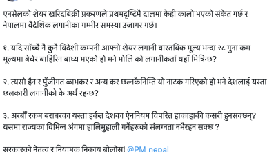 ‘त्यसो हैन र पुँजीगत लाभकर र अन्य कर छल्नकै निम्ति यो नाटक गरिएको हो भने देशलाई यस्ता छलकारी लगानीको के अर्थ रहन्छ?’, उनले अरु प्रश्न गर्दै भनेका छन्, ‘अर्बौँ रकम बराबरका यस्ता हर्कत देशका ऐन नियमविपरीत हाकाहाकी कसरी हुनसक्छन्रु यसमा राज्यका विभिन्न अंगमा हालिमुहाली गर्नेहरूको संलग्नता नभइरहन सक्छ ?’