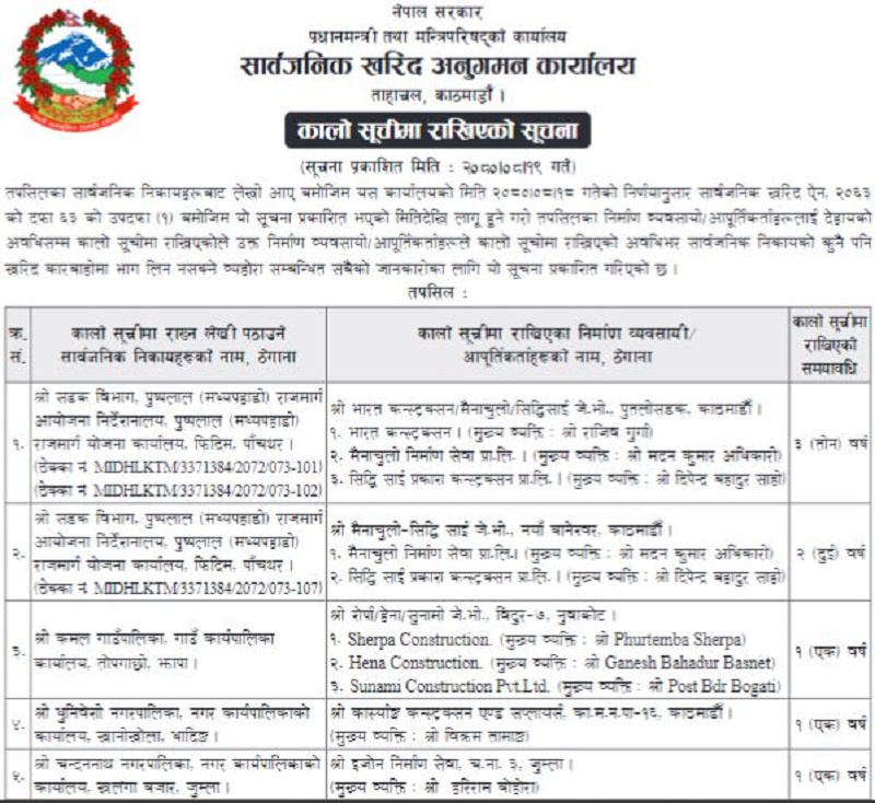 काठमाडौं, १९ मंसिर ।  सार्वजनिक खरिद अनुगमन कार्यालयले सम्झौताअनुसार काम नगर्ने थप पाँच वटा निर्माण कम्पनी तथा आपूर्तिकर्तालाई कालोसूचीमा राखेको छ । कार्यालयको हिजो बसेको बैठकबाट भएको निर्णय अनुसार सार्वजनिक खरिद ऐन, २०६३ को दफा ६३ को उपदफा १ अनुसार पाँच वटा निर्माण व्यवसायी र आपूर्तिकर्तालाई कालोसूचीमा राखेर कारबाही गरेको हो ।विभिन्न सार्वजनिक निकायको सिफारिसका आधारमा निर्माण कम्पनी र आपूर्तिकर्तालाई कालोसूचीमा राख्ने निर्णय गरेको कार्यालयले जनाएको छ । कालोसूचीमा पर्नेमा भारत कन्स्ट्रक्सन–मैनाचुली–सिद्धिसाई जे।भी काठमाण्डौ, मैनाचुली–सिद्धि साई जे।भी काठमाण्डौ, शेर्पारहेनारसुनामी जे।भी नुवाकोट, कास्र्याङ कन्स्ट्रक्सन एण्ड सप्लायर्स काठमाण्डौ र इजोन निर्माण सेवा जुम्ला रहेका छन् ।