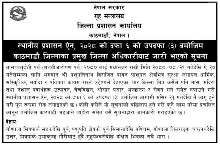 बालाचतुर्दशी पर्व (शतवीजारोपण पर्व) लाई मध्यनजर गर्दै यी क्षेत्रमा मंसिर २७ गतेसम्म यो नियम लागु हुने जिल्ला प्रशासन कार्यालय काठमाडौंले जनाएको छ ।