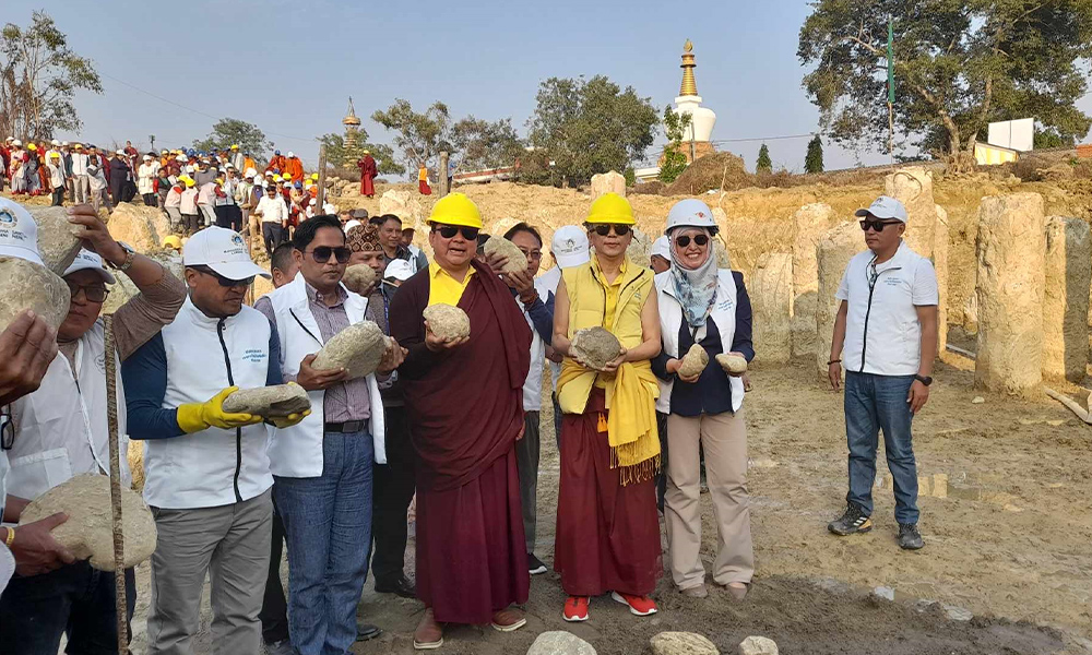 विश्व शान्ति धाम निर्माणमा सक्रिय महागुरु श्याल्पा तेन्जिग रिन्पोछे, लुम्बिनी विकास कोषका उपाध्यक्ष डा. ल्यारक्याल लामा, अमेरिकन दूतावासका प्रवक्ता जेहरा नाक्वीले शनिवार ढुंगा बिच्छाएर धाम निर्माणको पुन सुरुवात गरेका हुन् । उनीहरुले सुरुवात गरेपछि कार्यक्रममा सहभागीले पालैपालो श्रमदानमा सहभागी भएका थिए ।