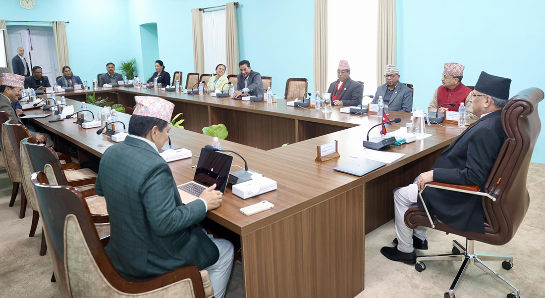 काठमाडौं, ४ पौष । मन्त्रिपरिषद्को नियमित बैठक जारी छ । सिंहदरबारमा भूकम्पले क्षतिग्रस्त भएपछि रेट्रो फिटिङ गरी पुनर्निर्माण गरिएको नयाँ भवनमा प्रधानमन्त्री कार्यालय सरेपछि मन्त्रिपरिषद्को बैठक पनि सोही भवनको बसेको हो ।