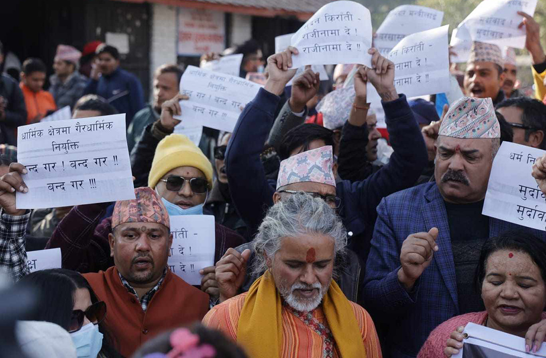 संस्कृतिमन्त्री किरातीलाई तत्काल बर्खास्त गर्न माग गर्दै पशुपति क्षेत्रमा विरोध प्रदर्शन