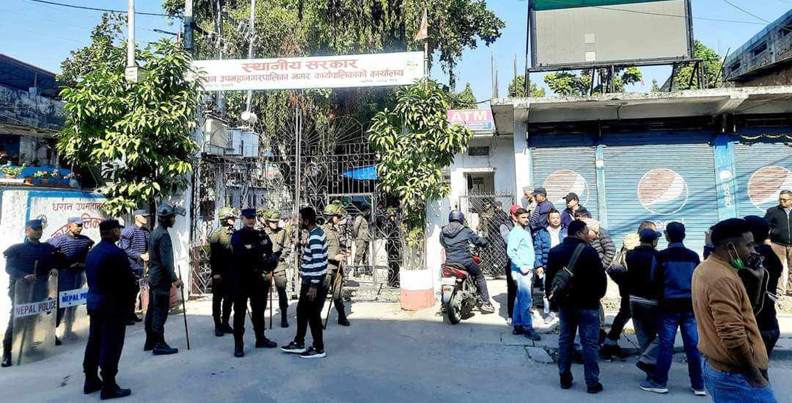 धरान उपमहानगरपालिकाको मुख्य द्वारमा सुरक्षाकर्मी राखेर कर्मचारीबाहेक अरुलाई प्रवेश गर्न दिइएको छैन।