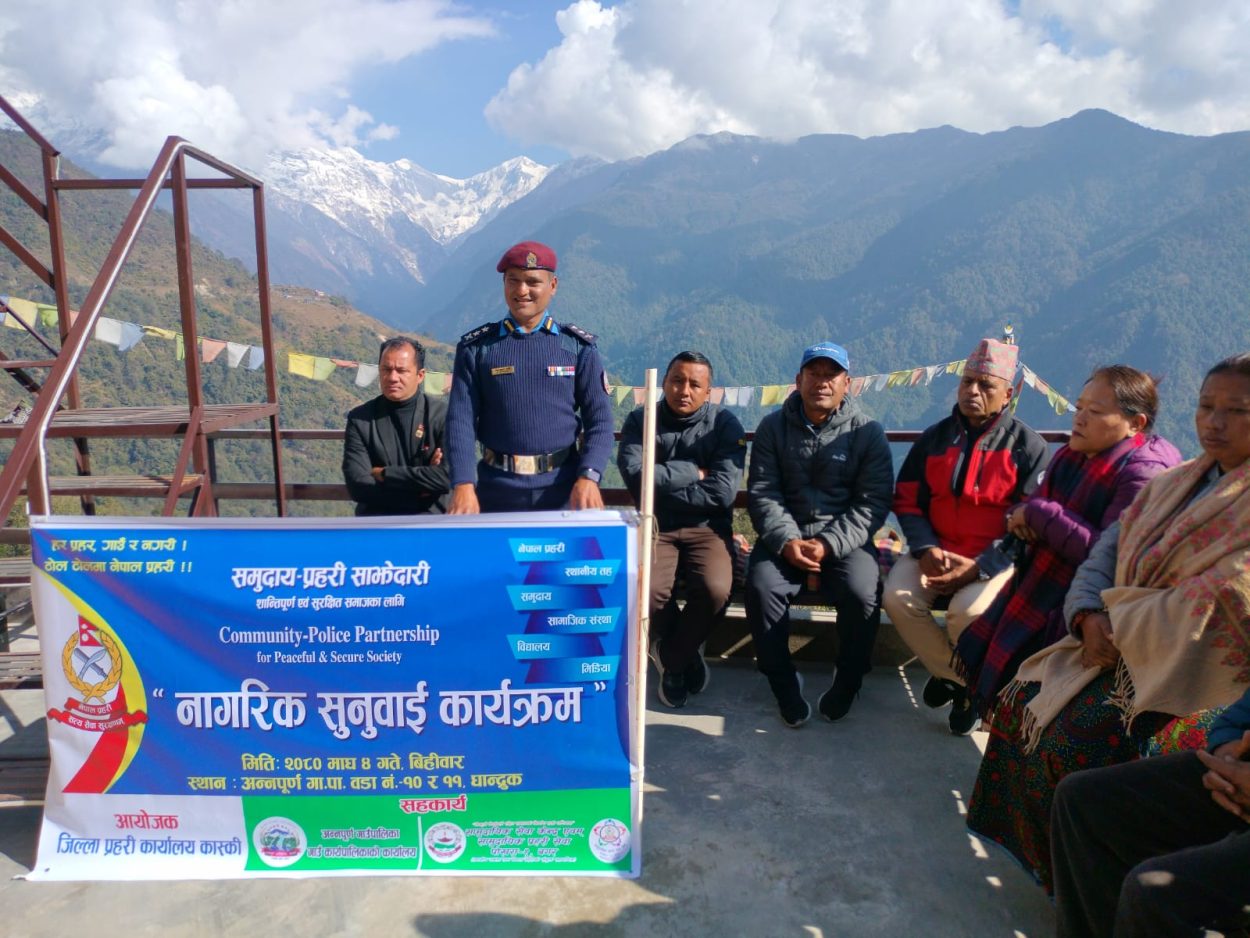पोखरा । जिल्ला प्रहरी कार्यालय कास्कीको आयोजना तथा अन्नपूर्ण गाउँपालिकाको सहकार्यमा जिल्ला कास्की अन्नपूर्ण गाउँपालिका वडा नं. १० र ११ को घान्द्रुकमा नागरिक सुनुवाई कार्यक्रम सम्पन्न गरेको छ ।
