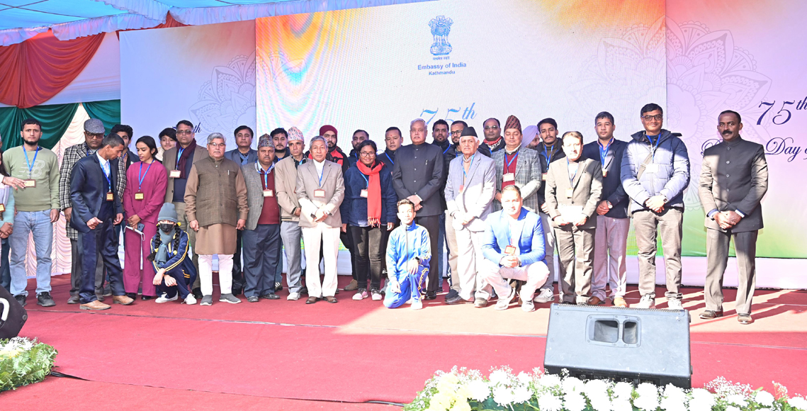 काठमाडौं १२ माघ । काठमाडौंस्थित भारतीय राजदूतावासले शुक्रबार ७५ औं गणतन्त्र दिवस मनाएको छ। भारतीय राजदूत नवीन श्रीवास्तवले भारतको राष्ट्रिय झण्डा झण्डोत्तोलन गरेसँगै गणतन्त्रको दिवसको अवसरमा आयोजित कार्यक्रमको शुभारम्भ भएको छ।