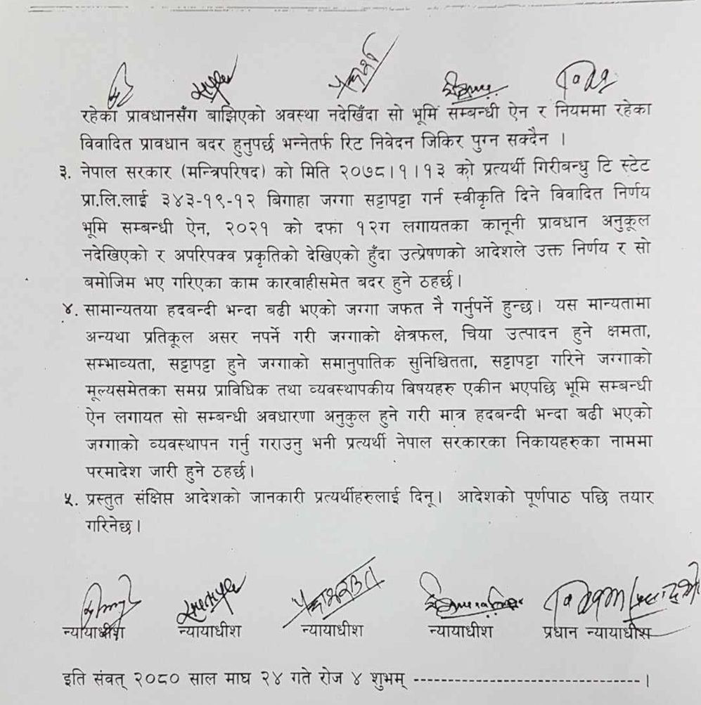 प्रधानन्यायाधीश विश्वम्भरप्रसाद श्रेष्ठ तथा न्यायाधीशहरु ईश्वरप्रसाद खतिवडा, प्रकाशमान सिंह राउत, सपना मल्ल प्रधान र सुष्मालता माथेमाको संवैधानिक इजलासले बुधबार गरेको आदेशअनुसार अब टी स्टेट मासेर घर बनाउन पाइने छैन ।