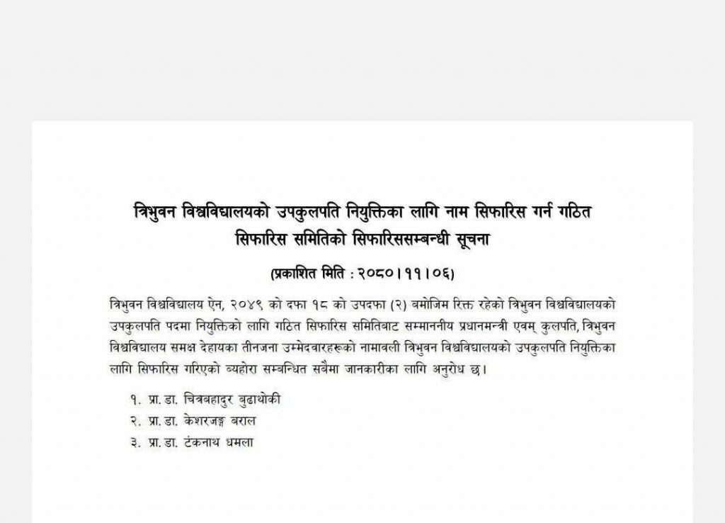 काठमाडौं । त्रिभुवन विश्वविद्यालयको रिक्त उपकुलपतिको लागि तीनजनाको नाम सिफारिस भएको छ ।