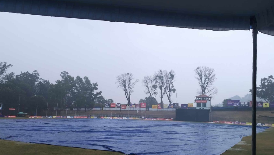 अहिले मेघ गर्जनसहित वर्षा भएको छ । मैदानमा कभर ढाकिएको छ । दुबै टोलीका खेलाडी पभेलिएन आएका छन् ।