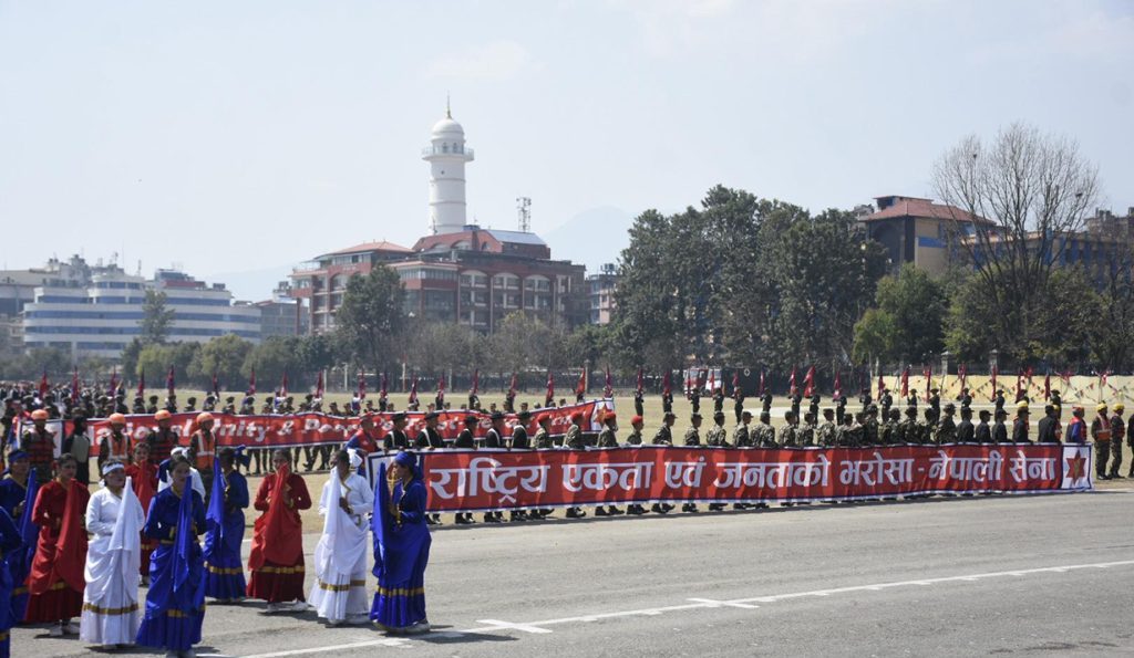 सैनिक मञ्चमा आयोजित समारोहमा परेड ९शस्त्राभ्यास० तथा तोप बढाइँ, कवाज, प्यारासुटलगातका प्रस्तुति देखाइएको छ ।