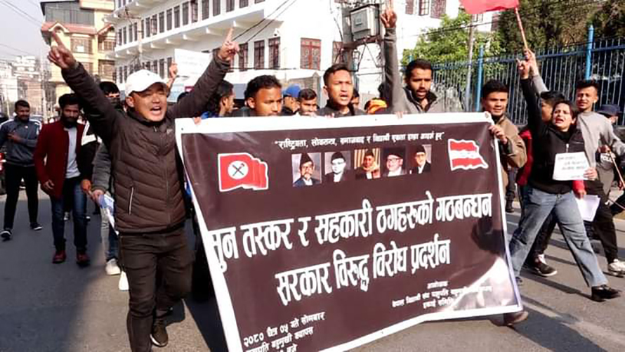 उनीहरूले यो सरकारलाई सुन तस्कर र सहकारी ठगहरूको गठबन्धन भन्दै नाराबाजी गरे भने उपप्रधानमन्त्री तथा गृहमन्त्री रवि लामिछानेको राजीनामा माग गरेका छन् । प्रदर्शनकारीले ‘सहकारी पीडितहरूलाई न्याय दे’ भन्दै नाराबाजी पनि गरे ।