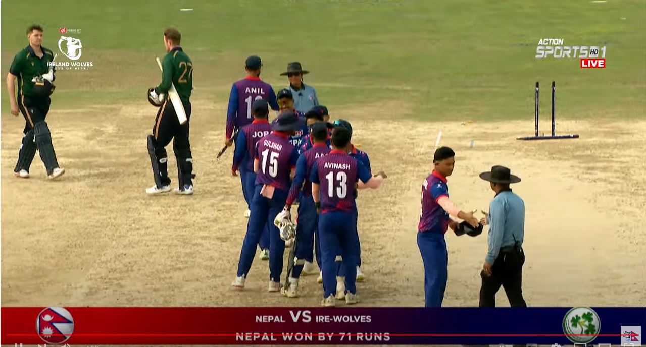 आयरल्यान्ड ए का म्याथ्यु फस्टरले ३ र बेन ह्वाइटले २ विकेट लिए । फिन ह्यान्ड र गेभिन होईले १–१ विकेट लिए । नेपाल पहिलो खेलमा ६ विकेटले विजयी भएको थियो ।