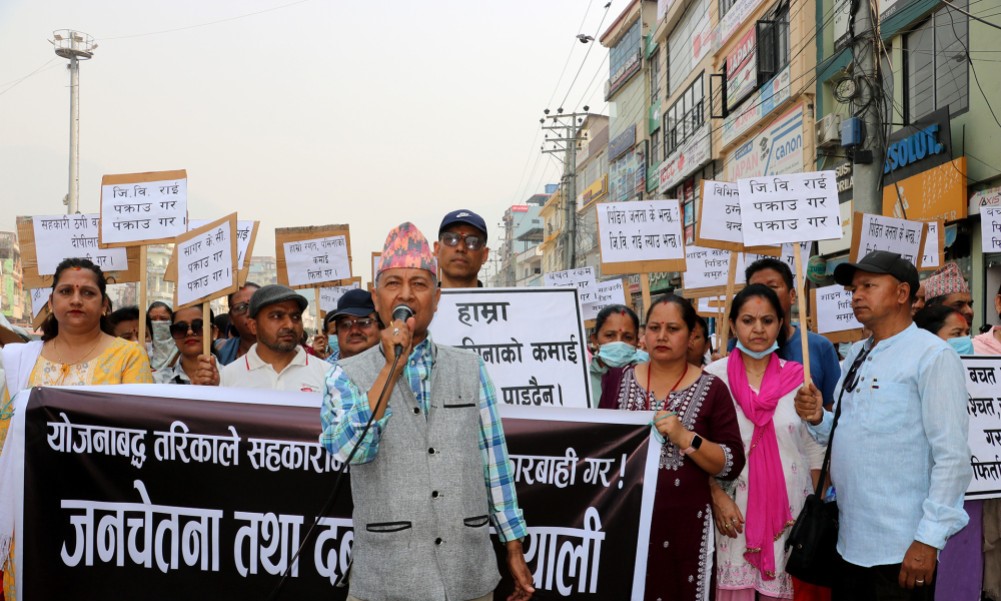 बुटवलको राजमार्ग चौराहामा भेला भएका पीडितले विभिन्न माग उल्लेख गरिएका प्लेकार्ड बोकेर प्रदर्शन गरेका थिए । राजमार्ग चौराहाबाट नाराबाजी गर्दै पीडित बुटवलको ट्राफिक चोकसम्म पुगेका थिए ।