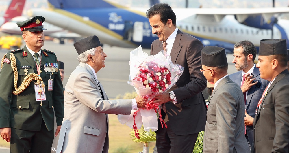 लगानी सम्मेलनको पूर्वसन्ध्यामा राष्ट्रपति रामचन्द्र पौडेलको मैत्रीपूर्ण निमन्त्रणामा कतारका अमिर शेख तमिम बिन हमाद अल थानी आज नेपाल भ्रमणमा आउनुभएको छ । कतारी अमिरको भ्रमणले नेपालको स्वदेशी वस्तुहरूको निर्यात प्रवर्द्धनका लागि पहल गर्ने सुनौलो अवसरका रूपमा लिन सकिने उहाँहरूको बुझाइ छ ।