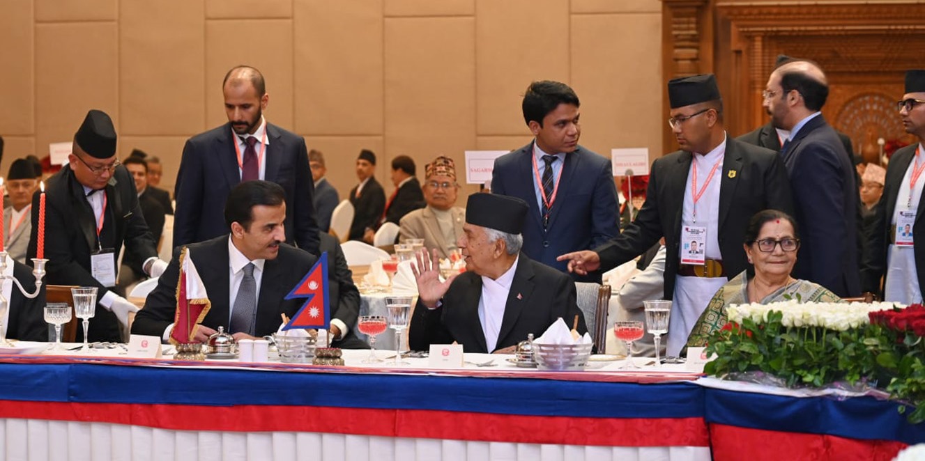 काठमाडौं ११ बैशाख । राष्ट्रपति रामचन्द्र पौडेलले नेपालको दुई दिने राजकीय भ्रमणमा आउनुभएका कतारका अमिर शेख तमिम विन हमाद अल थानीको सम्मानमा आज साँझ यहाँ रात्रिभोजको आयोजना गर्नुभएको छ । सो अवसरमा विविध सांस्कृतिक झलक पनि प्रस्तुत गरिएको छ ।