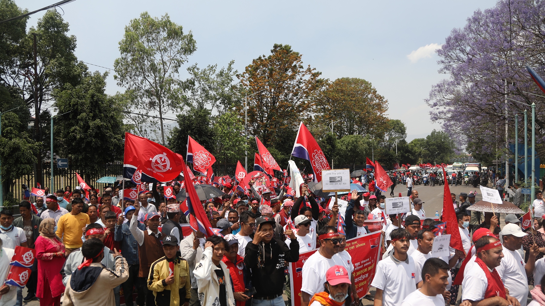 ‘नयाँ सामाजिक सम्झौताको लागि सुदृढ लोकतन्त्र, सामाजिक सुरक्षा र मर्यादित रोजगारी सहितको अर्थतन्त्र’ मूल नारा सहित विभिन्न मजदुर संघ संगठनसँग आबद्ध संस्थाले ब्यानरसहित भृकुटीमण्डपबाट र्याली निकालेका छन्।