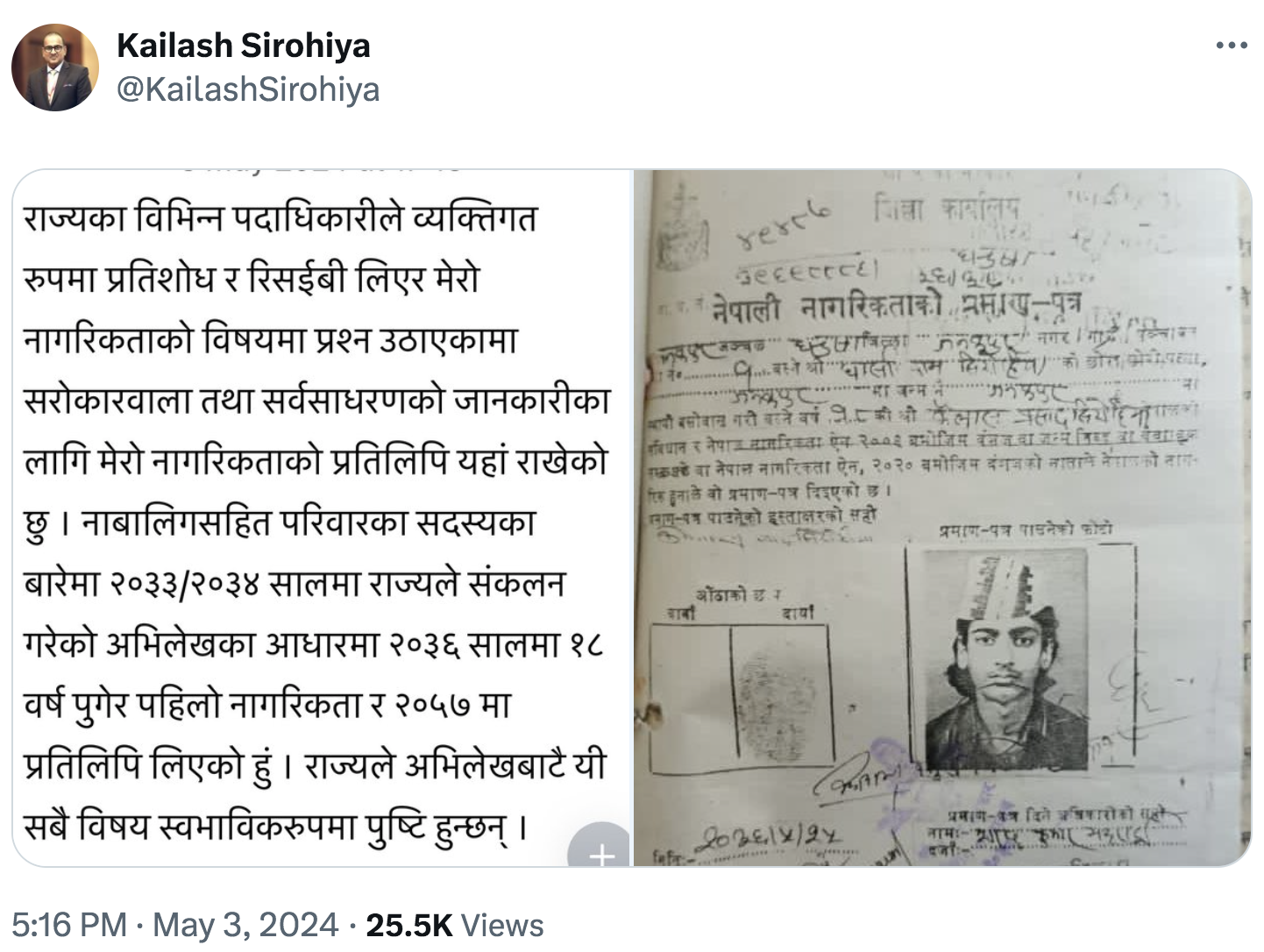 सिरोहियाले सार्वजनिक गरेको आफ्नो नागरिकताको प्रतिलिपि–