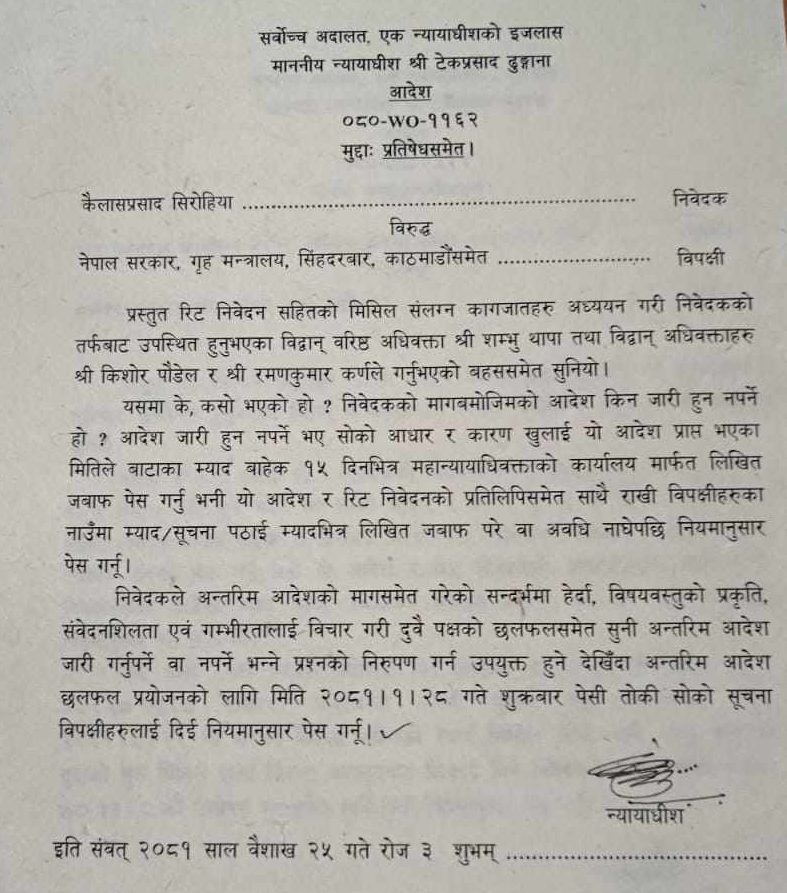 सिरोहियाले अन्तरिम आदेशसमेत माग गरेको भन्दै सर्वोच्च अदालतले त्यसबारे छलफल गर्न आगामी शुक्रबार अन्तरिम आदेश छलफलका लागि झिकाउन आदेश दिएको छ।