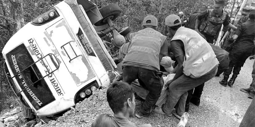सो दुर्घटनाबाट दुई जनाको मृत्यु भएको छ । मृत्यु हुनेहरुको सनाखत हुन बाँकी छ । बसमा सवार १८ जना घाइते भएका छन् । घाइतेहरुको उपचारको लागि प्रदेश अस्पताल सुर्खेत र कर्णाली कियरमा लगिएको जिल्ला प्रहरी कार्यालय सुर्खेतका प्रमुख रुपेश खड्काले जानकारी दिनुभयो । उहाँका अनुसार कर्णाली प्रदेश ०२ ००१ ख ०८५२ नम्बरको मिनी बस दुर्घटनामा परेको हो ।