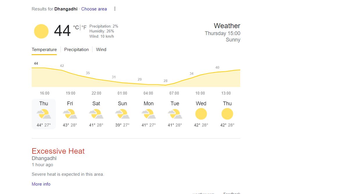 कार्यालयका मौसम विज्ञान सहायक सिंगल चौधरीले दिउँसो मापन गरिएको रेकर्डअनुसार बुधबार ४३.३६ डिग्री सेल्सियसको रेकर्ड बिहीबार नै तोडिएको बताए । बिहीबारको तापक्रम वर्षकै सर्वाधिक भएको मौसम तथा विज्ञान विभागले जनाएको छ ।