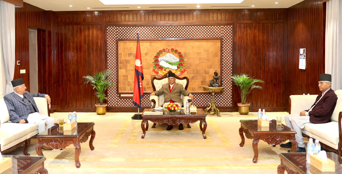 बालुवाटारमा प्रचण्ड, ओली र देउवाबीच छलफल जारी