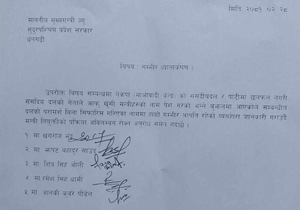 माओवादी सांसद खगराज भट्ट, झपट साउद, शिव ओली, रमेश धामी र जानकी कुवर पौडेलले संयुक्तरूपमा ध्यानाकर्षण बुझाएका हुन् । आज बिहान ११ बजे दलको बैठक आह्वान गरेर मन्त्री सिफारिस गर्ने सल्लाह भएको तर दलको बैठक स्थगित गरेर मन्त्रीको नाम दिएको उनीहरुको दाबी छ ।