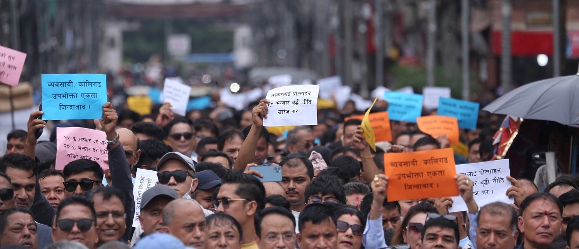 व्यवसायीहरूले न्युरोड गेटदेखि ब्यानर र प्लेकार्डसहित सिट्ठी र नारा लगाउँदै प्रदर्शन गरेका थिए।