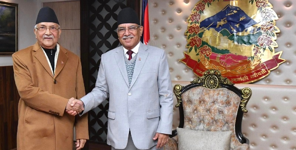 काठमाडौं १६ असार । प्रधानमन्त्री पुष्पकमल दाहाल प्रचण्ड र नेकपा एमालेका अध्यक्ष केपी शर्मा ओलीबीच भेटवार्ता भएको छ । सिंहदरबारमा जारी भेटमा समसामयिक परिस्थिति र सरकारका कामबारे छलफल भइरहेको स्रोतले बतायो ।