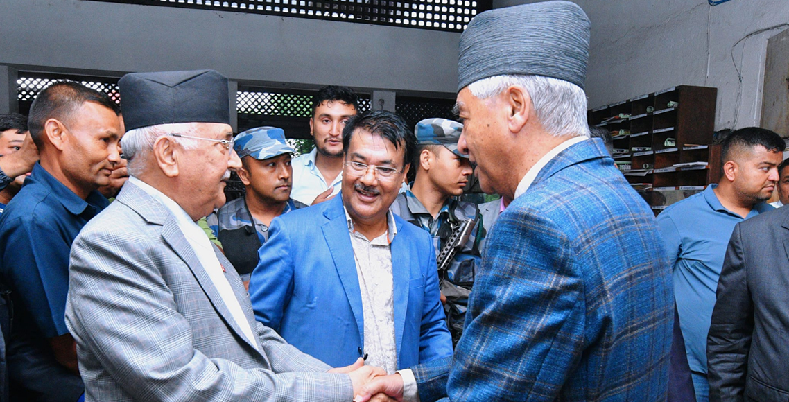 कांग्रेस मुख्यालयमा देउवाले गरे ओलीलाई स्वागत