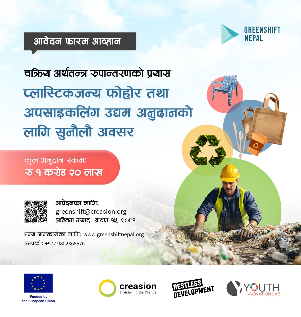 क्रिएसन नेपालद्वारा सञ्चालित ग्रीनसिफ्ट परियोजनाअन्तर्गत प्लास्टिकजन्य फोहोरमैला उद्यम व्यवस्थापनका लागि १ करोड २० लाख बराबरको अनुदान सहयोग ईयूले दिने भएको हो ।