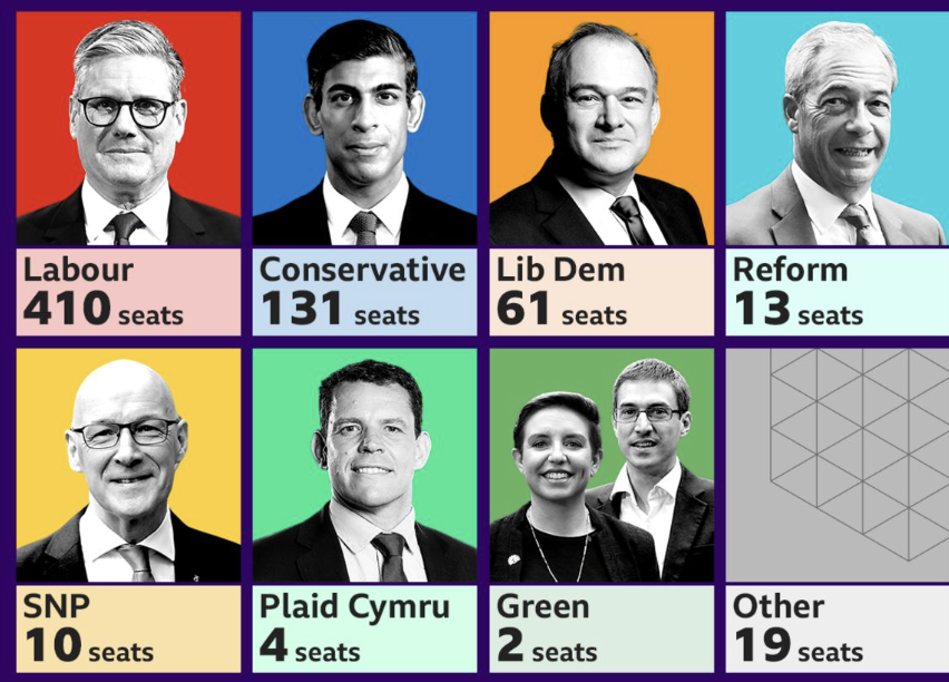 लेबर पार्टीले यभन्दा कहिल्यै प्राप्त गरेको सबैभन्दा धेरै सिट संख्याको रेकर्ड बराबर गर्ने अनुमान गरिएको थिएन । १९९७ मा टोनी ब्लेयरको भारी विजयमा ४१८ सिट जितेको थियो । लिबरल डेमोक्र्याट्सले पनि आफ्नो स्थिति सुधार गरेका छन् । २०१९ मा ११ सिटबाट बढेर यसपटक ६१ सिट जित्ने अनुमान गरिएको छ ।
