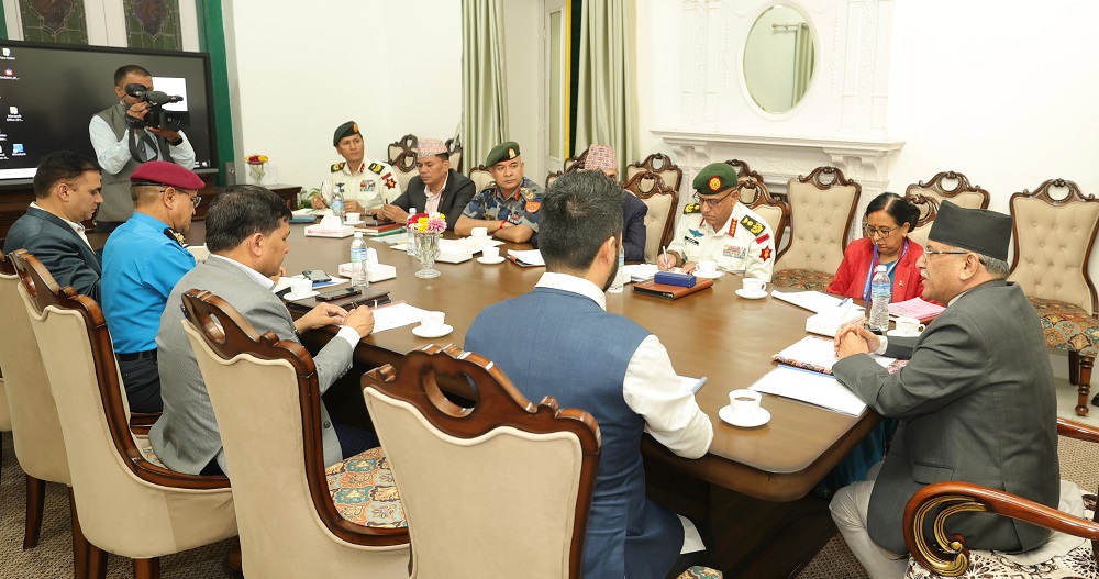 सो क्रममा प्रधानमन्त्रीले नेपाल प्राकृतिक विपत्तिको उच्च जोखिमयुक्त देश भएकाले तीनवटै सुरक्षा अङ्गको समन्वयात्मक पहलमा विपद् व्यवस्थापनको पूर्वतयारीको व्यवस्थित काम गर्न निर्देशन दिनुभयो ।