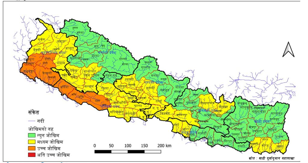 यसैगरी कर्णाली, बबई, पश्चिम राप्ती, पश्चिम सेतीमा मध्यम जोखिमको सम्भावना छ । झापा, मोरङ, सुनसरी, बारा, पर्सा, मकवानपुर, सिन्धुपाल्चोक, दोलखा, चितवन, कास्की, बागलुङ, पर्वत, स्याङ्जा, म्याग्दी, नवलपरासी पूर्व र आसपासका जिल्ला भई बग्ने नदी तथा खोलाहरुमा आकस्मिक बाढीको मध्यम जोखिम छ ।