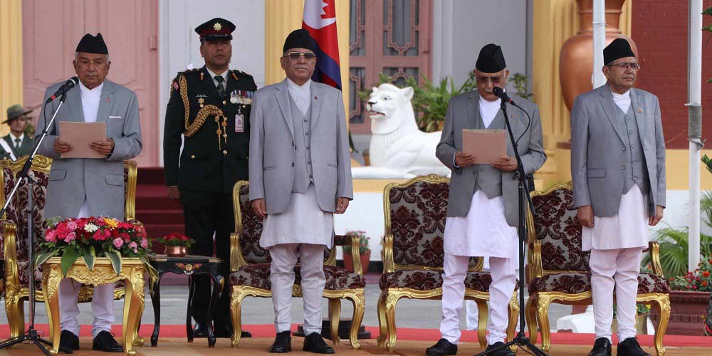 काठमाडौं ३१ असार । राष्ट्रपति रामचन्द्र पौडेलसमक्ष नवनियुक्त प्रधानमन्त्री खड्गप्रसाद ओली ९केपी ओली० ले सोमबार प्रधानमन्त्रीको पद तथा गोपनीयताको शपथ ग्रहण गर्नुभएको छ । नवनियुक्त प्रधानमन्त्री ओलीले दौरा सुरुवालमा शपथ लिनुभएको छ ।