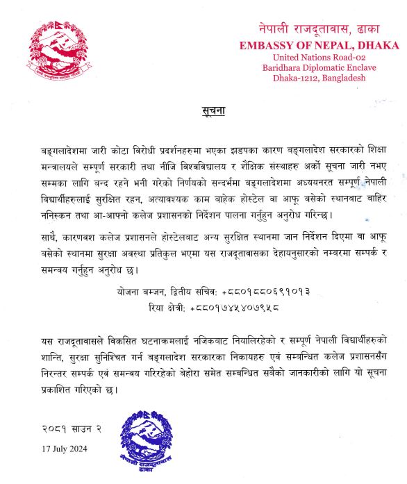 सूचनामा भनिएको छ, ‘बंगलादेशमा जारी कोटा विरोधी प्रदर्शनहरुमा भएका झडपका कारण बंगलादेश सरकारको शिक्षा मन्त्रालयले सम्पूर्ण सरकारी तथा नीजि विश्वविद्यालय र शैक्षिक संस्थाहरु अर्को सूचना जारी नभए सम्मका लागि बन्द रहने भनी गरेको निर्णयको सन्दर्भमा बंगलादेशमा अध्ययनरत सम्पूर्ण नेपाली विद्यार्थीहरुलाई सुरक्षित रहन, अत्यावश्यक काम बाहेक होस्टेल वा आफू बसेको स्थानबाट बाहिर ननिस्कन तथा आ–आफ्नो कलेज प्रशासनको निर्देशन पालना गर्नुहुन अनुरोध गरिन्छ।’