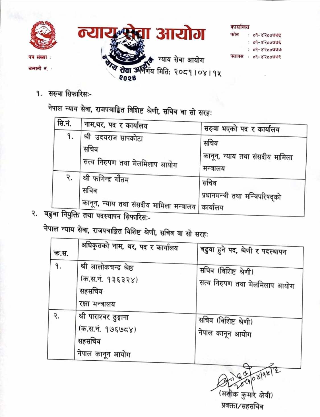 न्याय सेवातर्फका कानुन समुहका सहसचिव आलोकचन्द्र श्रेष्ठ र पाराश्वर ढुङगाना सचिव बढुवामा सिफारिस भएका हुन ।