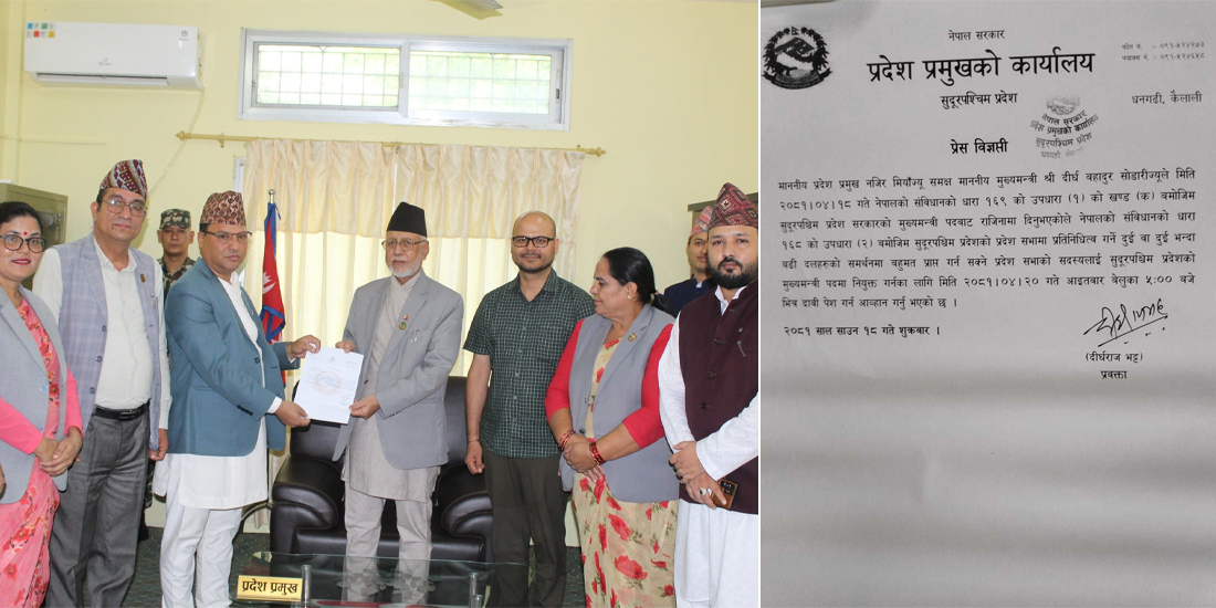 मुख्यमन्त्री दीर्घ सोडारीले आज राजीनामा दिएसँगै नयाँ सरकार गठनको लागि प्रदेश प्रमुख मियाँले संविधानको धारा १६८ को उपधारा २ बमोजिम सरकार गठनको लागि आह्वान गरेका छन् ।