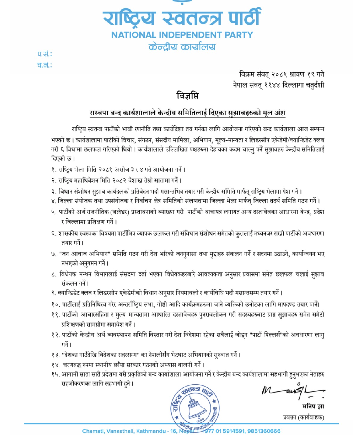 काठमाडौं १९ साउन । राष्ट्रिय स्वतन्त्र पार्टीको बन्द कार्यशालाले पार्टीलाई १५ बुँदे सुझाव दिएको छ। केन्द्रीय समितिलाई दिएको सुझावमा पार्टीको पहिलो महाधिवेशन आगामी वैशाखमा गर्न भनेको छ।