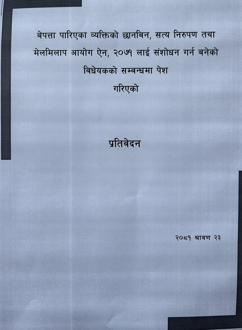 काठमाडौं । बेपत्ता पारिएका व्यक्तिको छानबिन, सत्य निरुपण तथा मेलमिलाप आयोग ऐन, २०७१ लाई संशोधन गर्न बनेको विधेयकका सम्बन्धमा गठित राजनीतिक कार्यदलले शीर्ष नेताहरूलाई प्रतिवेदन हस्तान्तरण गरेको छ।