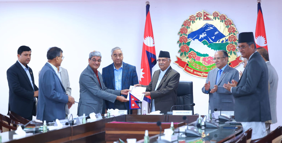 प्रधानमन्त्री तथा मन्त्रिपरिषद्को कार्यालय, सिंहदरबारमा आयोजित कार्यक्रममा प्रधानमन्त्री एवं नेकपा (एमाले) का अध्यक्ष ओली, नेपाली कांग्रेसका सभापति शेरबहादुर देउवा, नेकपा (माओवादी केन्द्र) का अध्यक्ष पुष्पकमल दाहाल ‘प्रचण्ड’ लाई प्रतिवेदन हस्तान्तरण गरिएको हो।